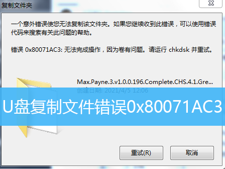 U盤復制文件錯誤0x80071AC