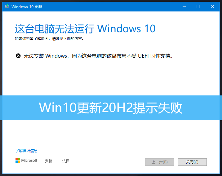 Win10更新20H2失敗,并且提示這臺電腦無法運行Windows 10,無法安裝 Windows ,因為這臺電腦