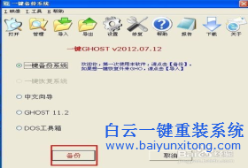 一鍵ghost工具可以用于備份還原系統,這是很多用戶都知道的事。但是一鍵ghost工具還可以用于重裝系統教程,這詳細很多用戶都不知道吧。其實也就是利用一鍵ghost工具的還原功能。下面白云就給大家說一說一鍵ghost安裝系統教程吧。1、首先肯定是要下載一個一鍵ghost工具的,下載好之后我們將一鍵ghost工具安裝到電腦上面,然后點擊一鍵備份。